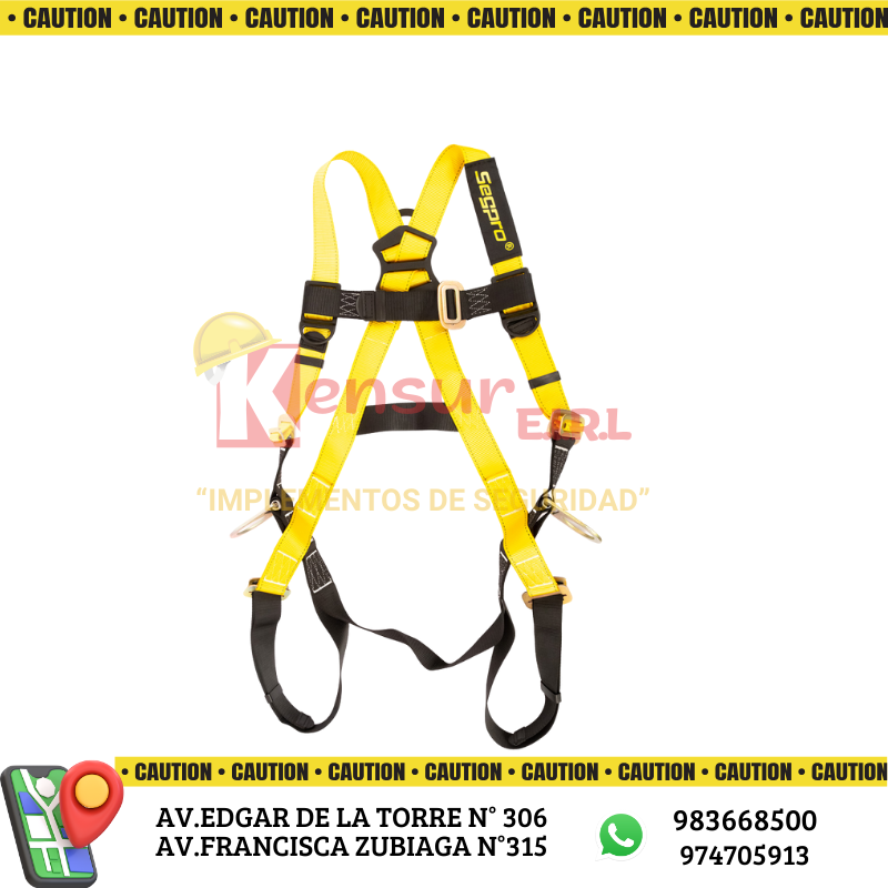 Nuestro arnés de cuerpo completo cuenta con tres anillos metálicos: uno en la espalda para riesgos de caída y dos en la cintura para trabajos de posicionamiento, además de correas ajustables para un mayor confort.